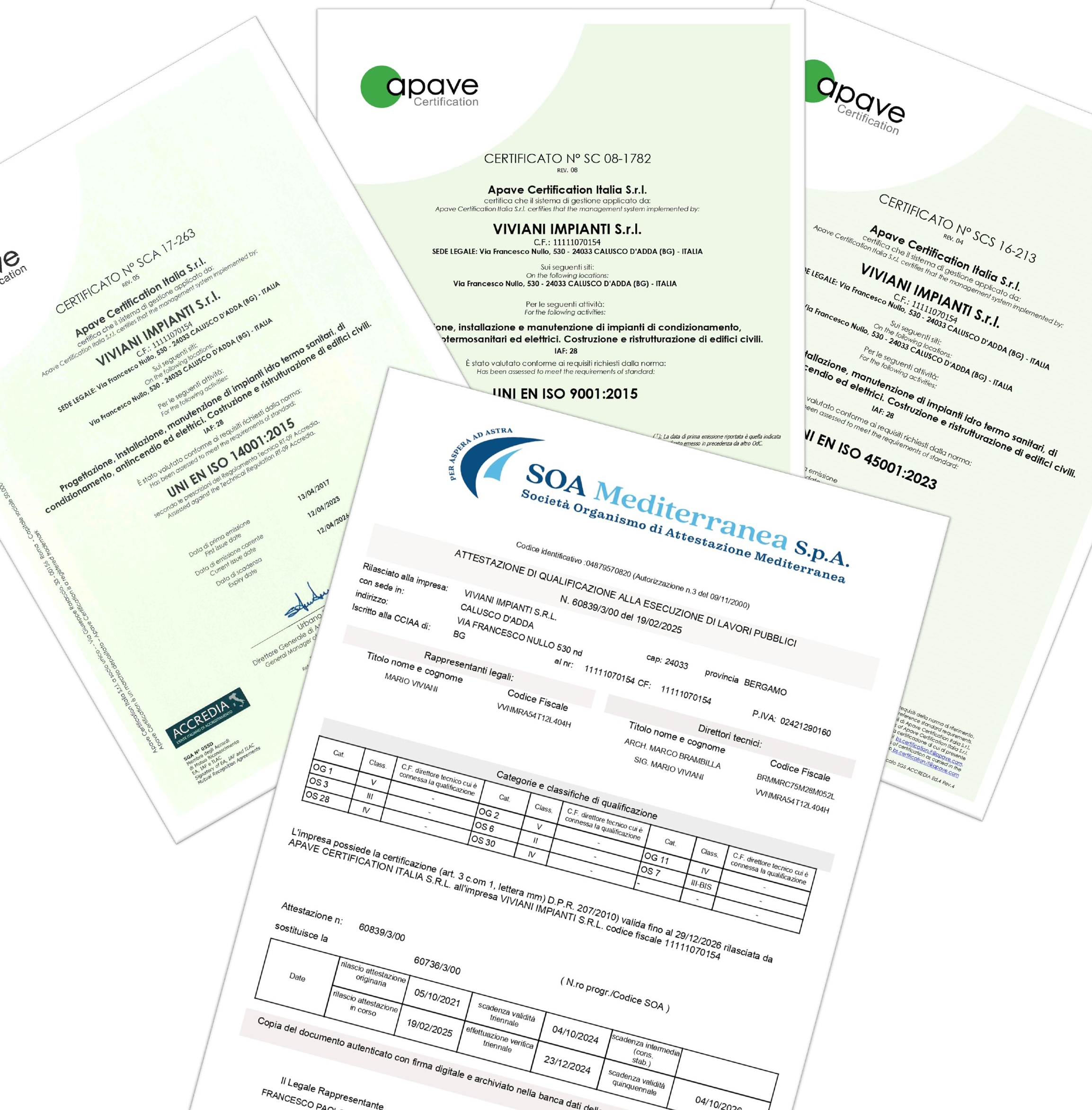 VIVIANI IMPIANTI S.r.l. ha adottato nel tempo e sostiene tutt’ora il “Sistema di Gestione Integrato per la Qualità, l’Ambiente, la Salute e Sicurezza” e pertanto tutto il personale dipendente e le persone che operano sotto il controllo dell’azienda sono sensibilizzate, informate e collaborano per perseguire l’obbiettivo primario di soddisfazione dei propri clienti nel rispetto della qualità, della salute e sicurezza dei lavoratori e dell’ambiente.